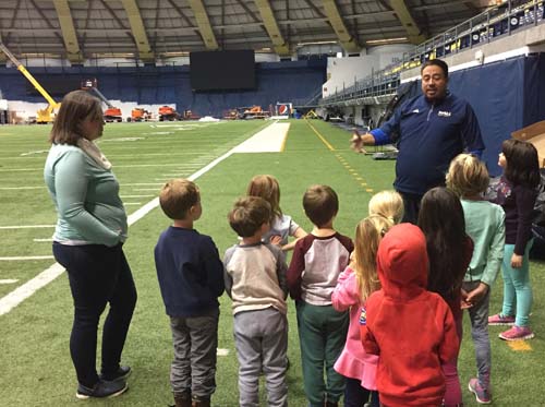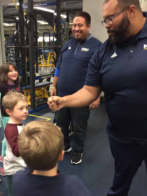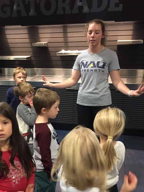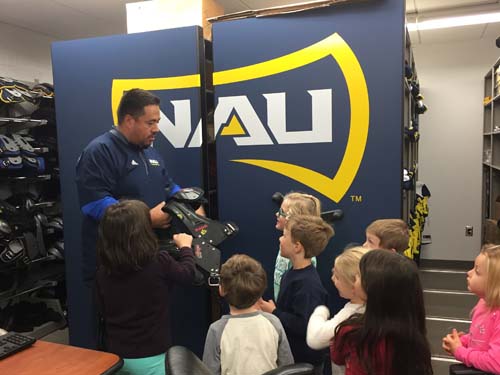 The kindergarten students from Westside were invited by the Northern Arizona University Athletic Department to tour the NAU Walkup Dome. The students bundled up for their mile walk from school to the Dome and set off first thing in the morning. They were greeted by Mr. Carlos, the head equipment manager for all of the sports teams at NAU.