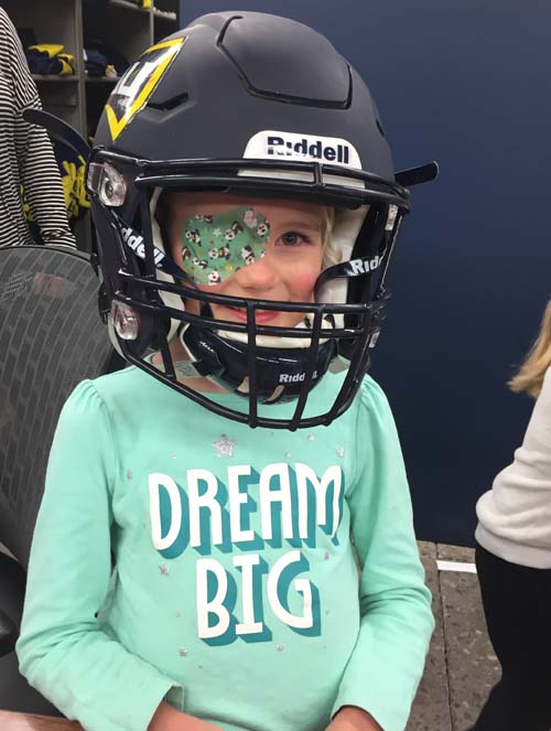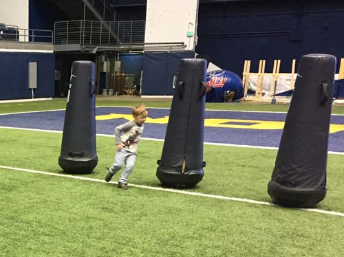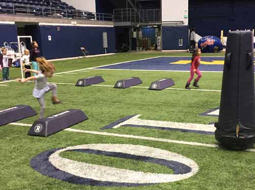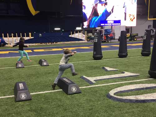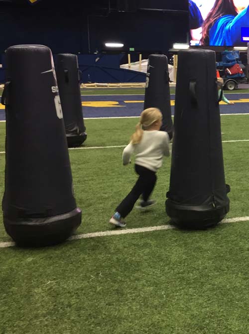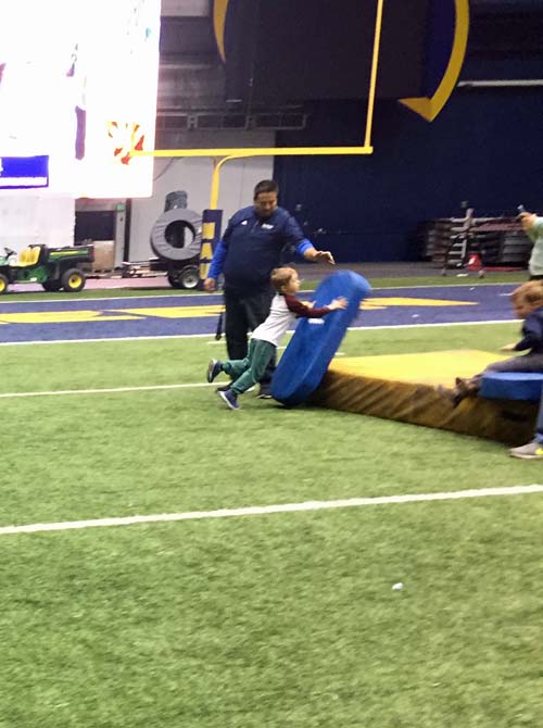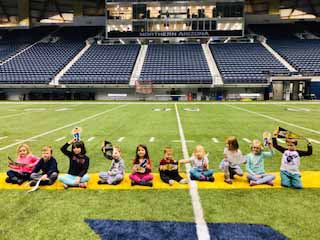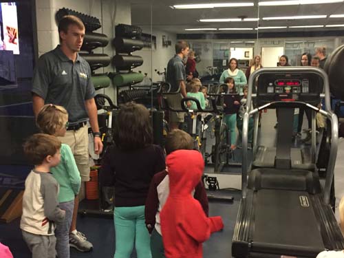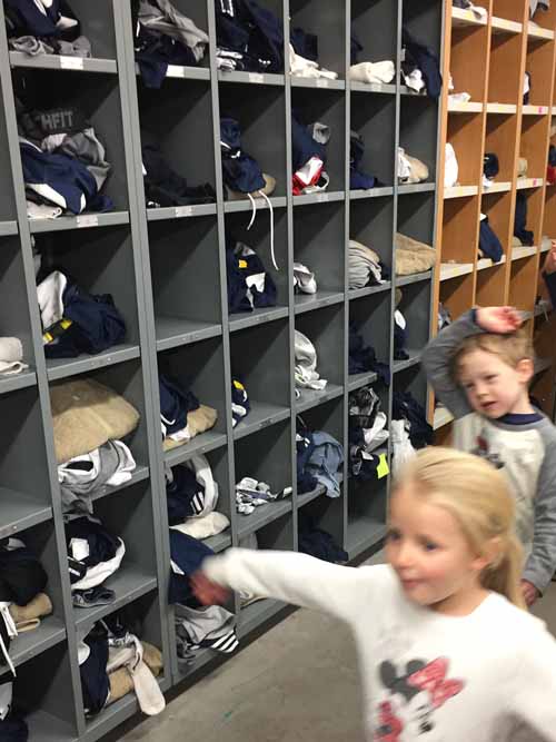 Next up, the kindergarteners visited the locker room, where all of the football players have their own cubbies and stools. This is where the players get ready for their home games and where they meet with their coaches during half time. There’s even a countdown clock that ticks away the time to the next game. The locker rooms were so professional looking and organized!