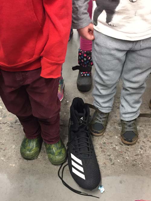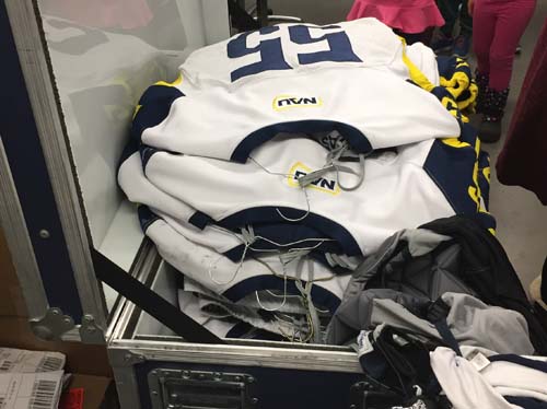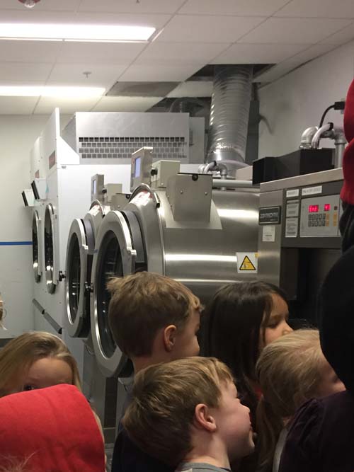 The next stop was to the equipment room, where Mr. Carlos told everyone about the huge undertaking of keeping track of all of the equipment. The students saw big shelves on wheels that held all of the gear for the football team. They were even able to try on a helmet and shoulder pads and compare their shoe size to a football player’s shoe! In the equipment room are huge washers and dryers where the players uniforms, socks, shirts and other clothes are cleaned after practices and games. Afterwards, the clean clothes go into cubbies so they’re ready for the next time a player needs them. The football team was getting ready for a game in Colorado, so Mr. Carlos showed the students huge trunks where the equipment and uniforms would be packed for the trip. He has a big job making sure everyone has everything they need!