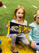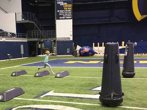 Once the students had a handle on all the work that it takes to get players ready for their sport, it was time to hit the field! Each kindergartener took turns running, jumping, dodging and tackling their way through an obstacle course. Mr. Carlos taught the students how to properly tackle by hugging! After that, they practiced teamwork by throwing, kicking and catching the ball. It sure is hard work being a college athlete! They were plenty tired and hungry when it was time to leave; good thing we stopped for pizza on the long walk home! Thank you to Mr. Carlos and everyone at the NAU Athletic Department who made our fun-filled visit possible!