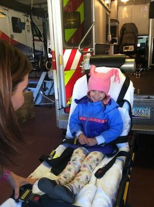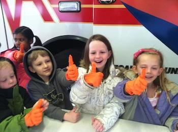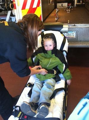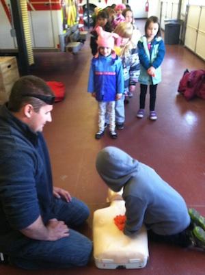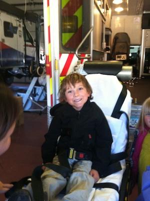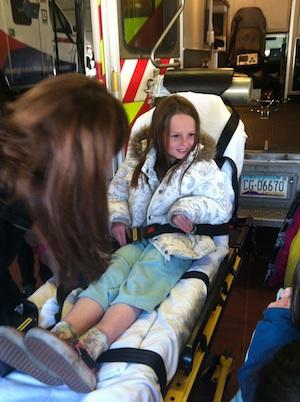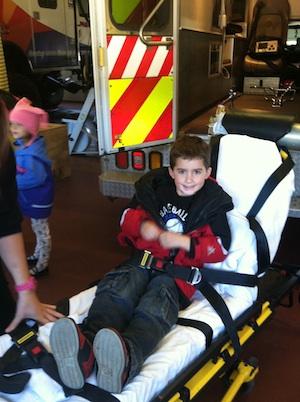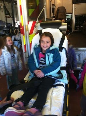 Each child got on the gurney, which was lifted up and down, got to see the lights of the ambulance up close and learned about the safety clothing and gear each paramedic needs during an emergency response. After the tours in the vehicles were complete we learned about CPR and practiced this life saving skill on a manikin.