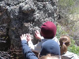 Then, we all headed out for a hike to put our senses into action! Ms. Lauren and Ms. Lisa encouraged the children to feel several rocks and talked about how the air bubbles in lava rocks make the rock feel rough. The children used their sense of smell to experience Ponderosa Pine trees in a whole new way!