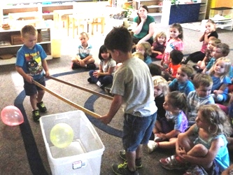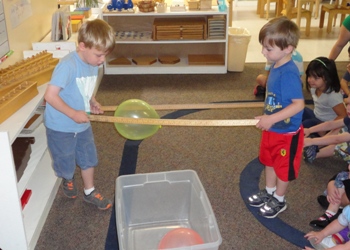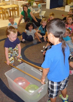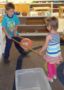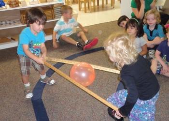 To demonstrate cooperation, the children attempted to get two balloons into a tub using two yardsticks. When just one person tries this, it’s a very difficult task! Balloons end up going everywhere! But when two people use cooperation, it’s much easier to get the balloons into the tub! Here are some photos from our fun cooperation activity: